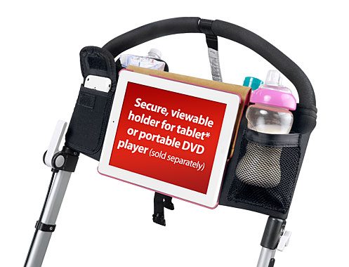 I must say that I have seen different stroller organizers, but none quite like this one. What makes the See ‘n Store stand out from the crowd and separates itself from the rest is the fact that this one of a kind organizer is up to date with the modern times and not only helps you to carry and organize your mom necessities, but it also features a secure, viewable holder for your tablet or DVD player.