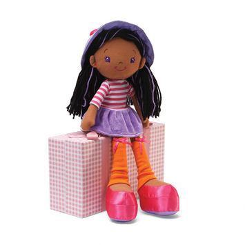 We received DeeDee for this review and she is one of the four different Gund girls. She is actually a really cute 17” doll with an adorable smiley face. The doll is as cute as can be and features black hair with lavender highlights, lavender skirt and hat…DeeDee is dressed with a combination of bright colors that will catch the attention of your little one.