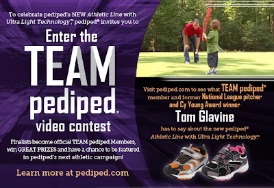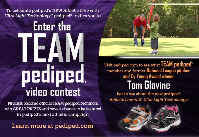 In celebration of their NEW athletic line Pediped invites you to enter the Team pediped video contest. Details are below for you. Visit pediped.com too to see what Tom Glavine, Team pediped member and former National League pitcher and Cy Young Award winner has to say about the new pediped athletic line with Ultra-Light Technology.